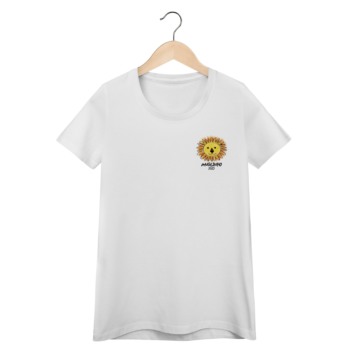Na frente, a estampa traz a cabeça de um leão desenhada por uma das crianças da turma — símbolo de força, alegria e do espírito aventureiro que marca essa nova etapa.