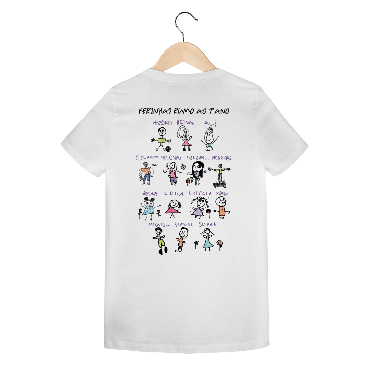 E nas costas, cada aluno deixou sua marca com um autorretrato feito à mão, transformando a camiseta em uma verdadeira galeria de arte e recordação única.