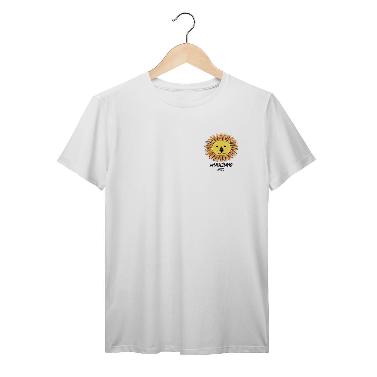 Na frente, a estampa traz a cabeça de um leão desenhada por uma das crianças da turma — símbolo de força, alegria e do espírito aventureiro que marca essa nova etapa.